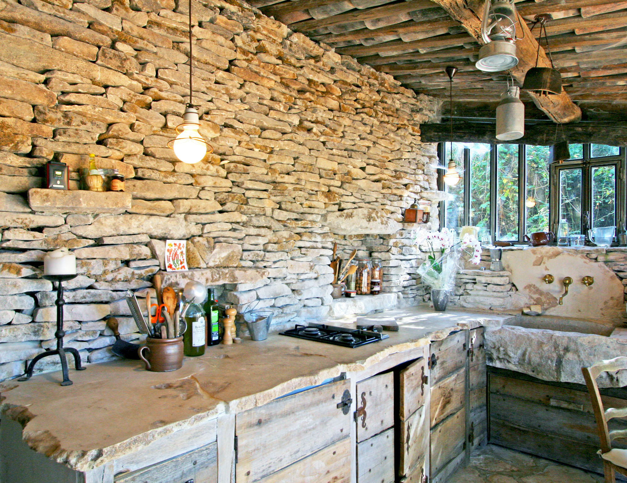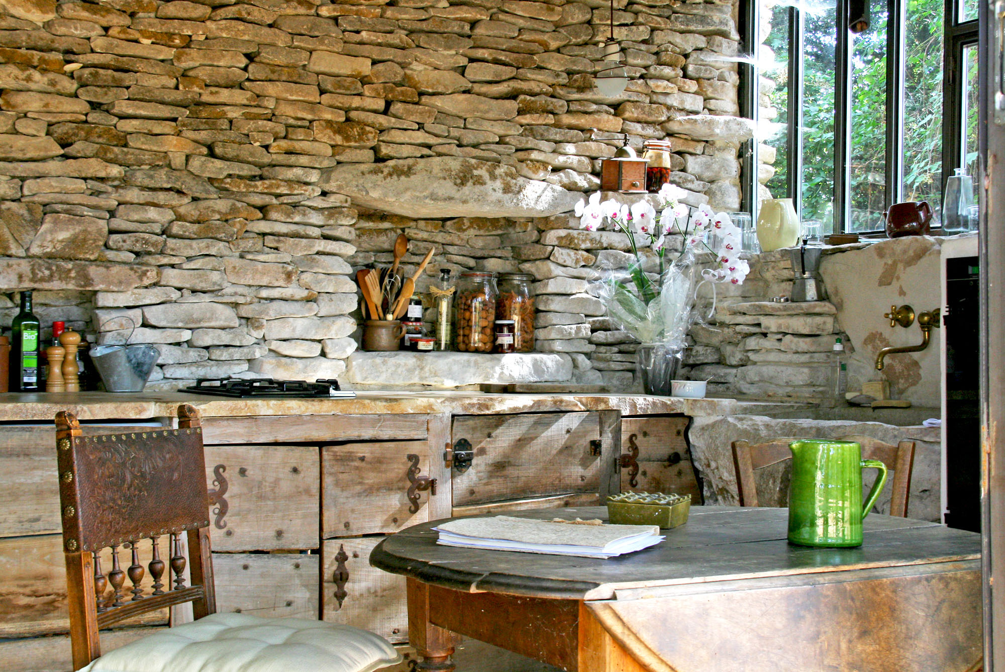 Patiemment redressés, ses quatre murs furent uniquement restaurés avec des pierres du coin, patinées par les ans. Dans la cuisine et la salle de bains, la maîtresse des lieux récupéra des pierres plates du champs alentour et, une à une, les tailla. Le sol de la douche, celui de la cuisine, ainsi que les plans de travail, les tables de chevet et quelques étagères furent, à chaque fois, un exploit : chaque pierre se devait d’être à la bonne dimension et s’emboîter parfaitement.