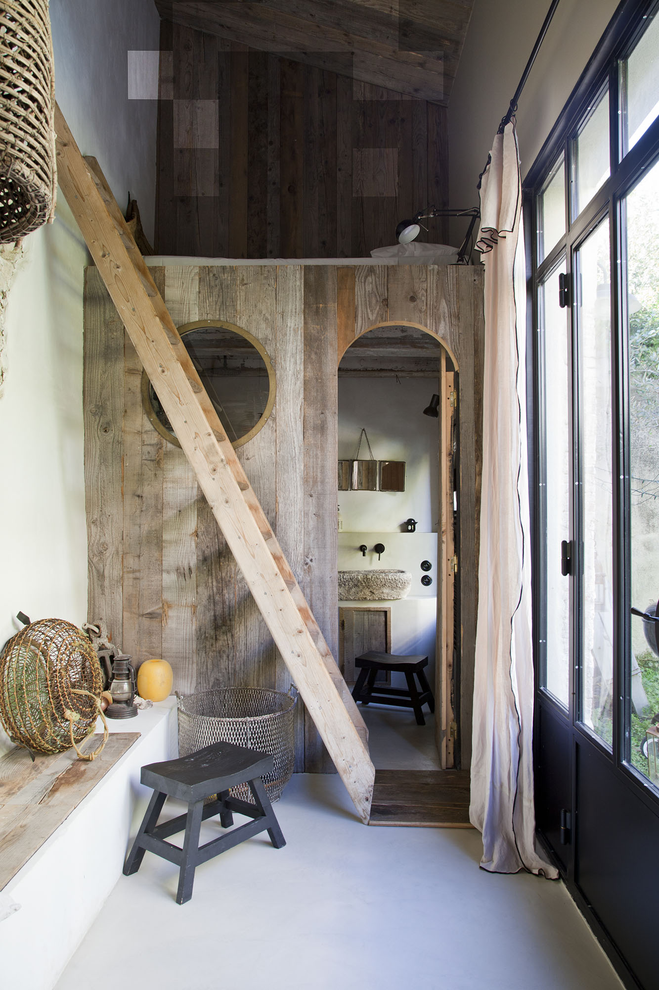 Nous sommes en ville mais le décor porte à croire qu’on dort plutôt à la campagne. Aujourd’hui, dès la porte passée, la demeure nous plonge dans un espace idéal, qui pourrait se situer n’importe où en Provence. On y découvre des espaces ouverts au soleil, un bassin de nage où fleurit un amandier, une terrasse sous la tonnelle où résonnent les tintements d’une vaisselle artisanale…